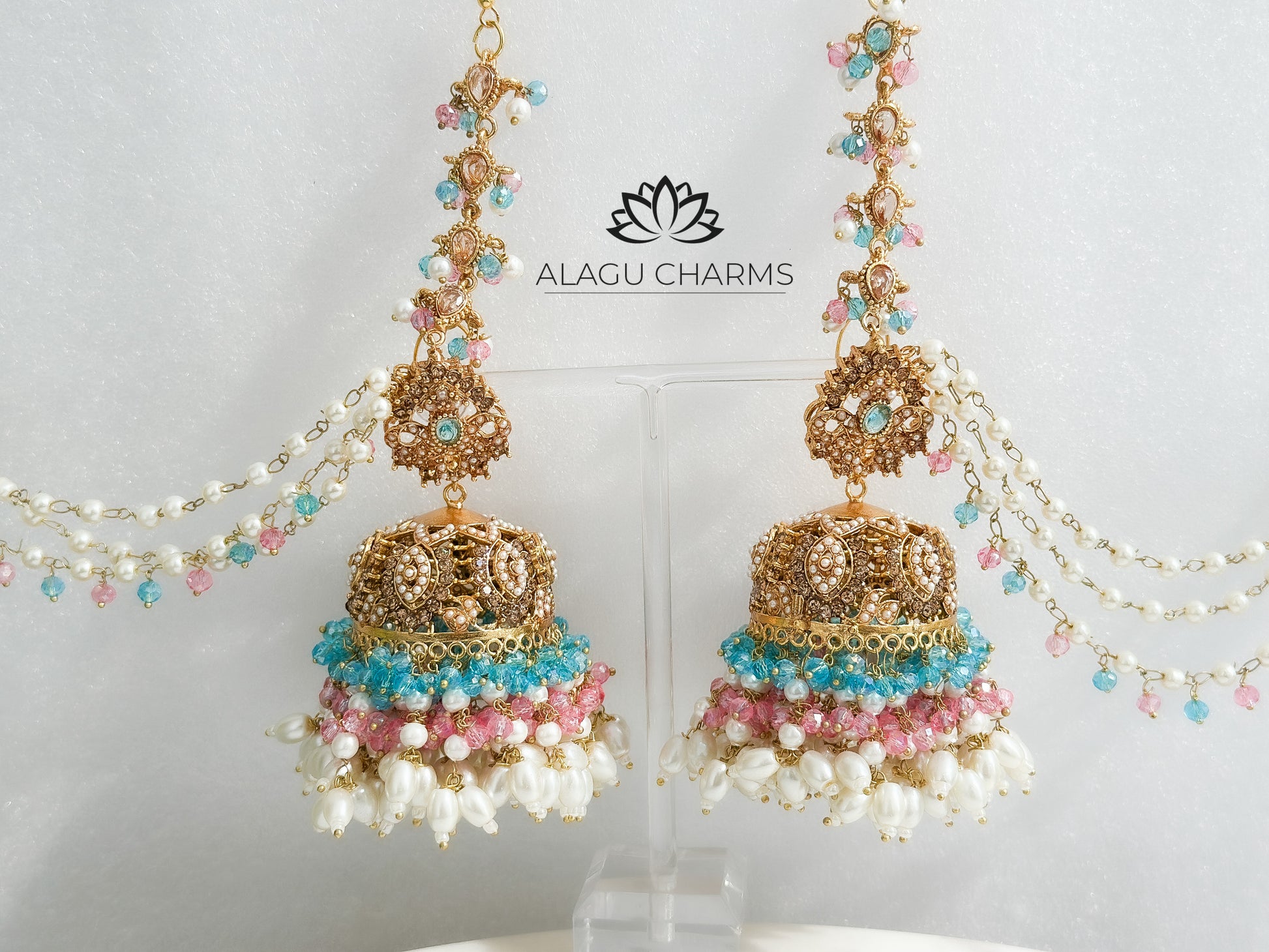 Pearl and stone-draped ear chains for added bridal elegance.