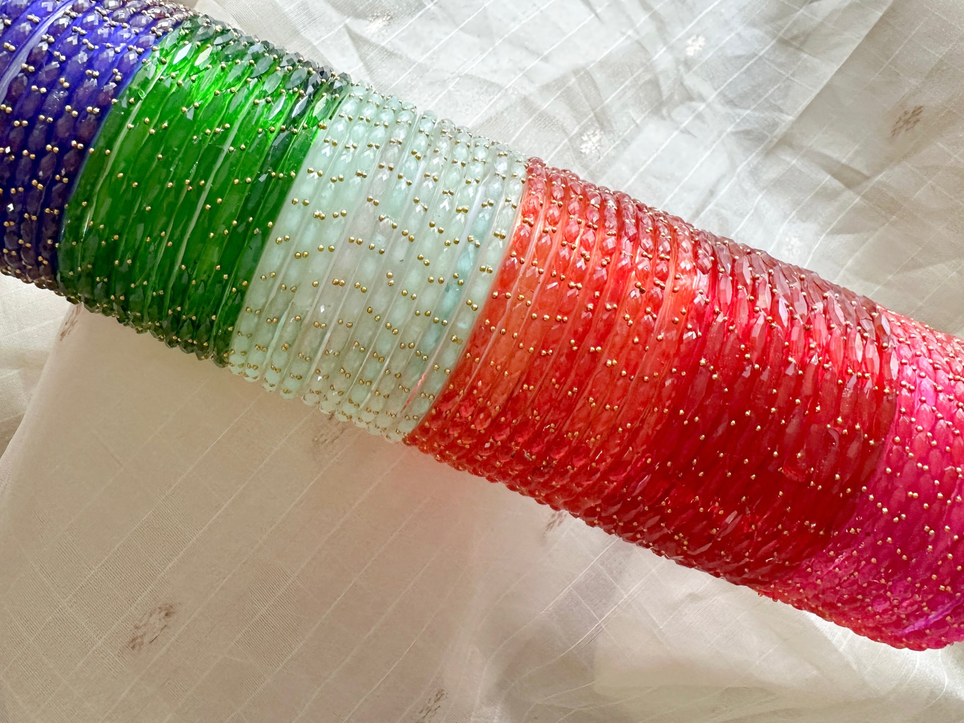Trending Rain drop glass bangles are available in six colours. There are 10 pieces of each colour.