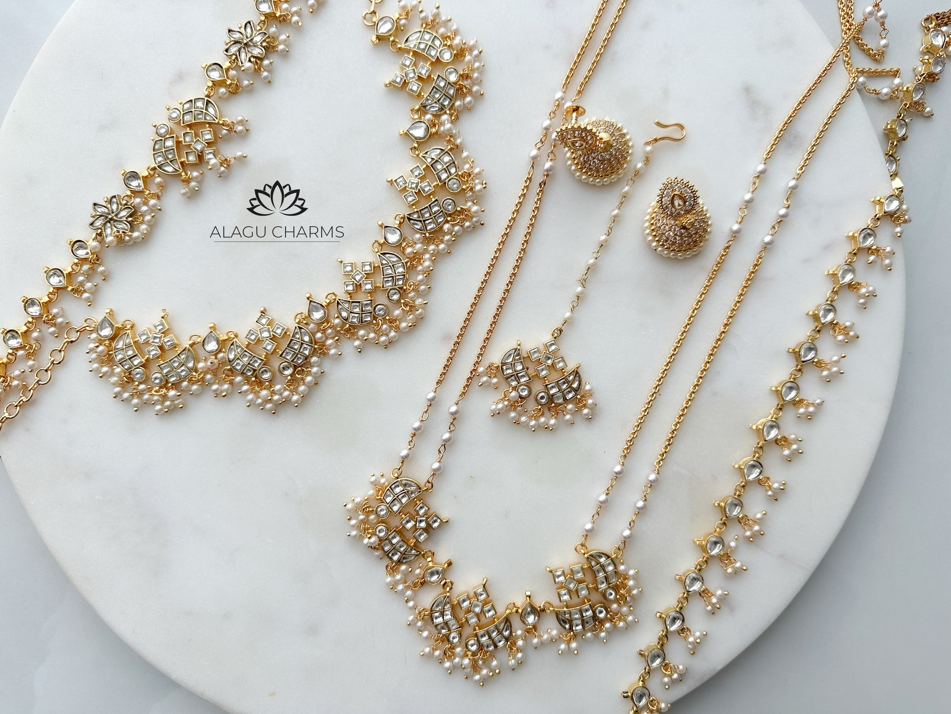 The set includes a necklace, choker, long chain, maang tikka, waist chain, and jhumka earrings. Each piece is crafted with intricate detailing, showcasing rich & white Kundan stones, and delicate pearl accents.